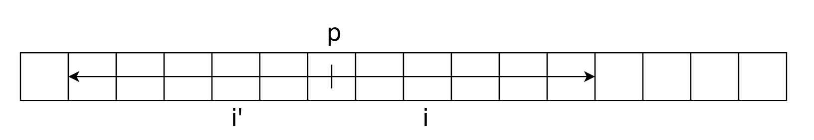 이 경우에는 이전에 구한 값을 재활용할 수 있다. d[p]를 중심으로 양옆으로 5까지는 문자열이 palindrome이라는 사실을 알고 있다. i를 중심으로하는 palindrome을 탐색하기 위해 이미 구했던 p를 중심으로 i와 대칭점에 있는 i'를 이용할 수 있다.