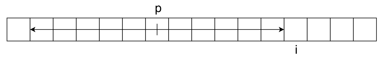 [0, i-1]에 대해서 각 위치를 중심으로 가능한 최대 palindrome의 길이 d[0..i-1]를 구했다고 가정하고, d[i]를 어떻게 이전 값을 재활용해서 효율적으로 구하는지 알아보자. [0, i-1]를 만족하는 위치 p에서 d[p]를 구할 때 palindrome이 충분히 길었으면 이미 i위치를 한번 탐색했을 것이고, 그렇지 않다면 탐색하지 않았을 것이다.