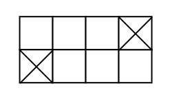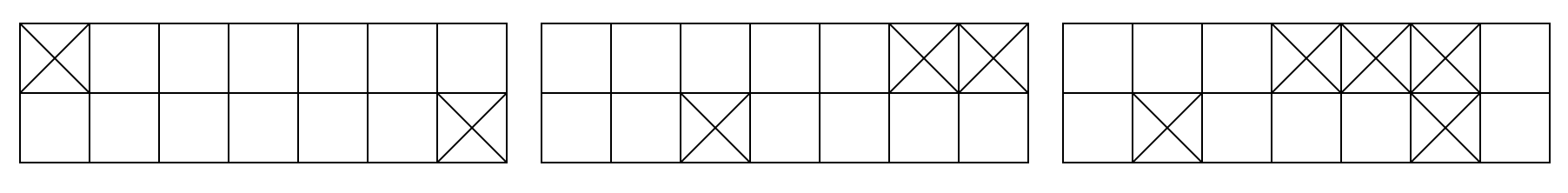 2 x n 게임판이 있고, 번갈아 가면서 게임을 진행한다. 각 플레이어는 1x1 또는 2x2의 정사각형을 하나씩 색칠할 수 있는데, 모든 칸이 색칠되어 더 이상 진행할 수 없는 플레이어가 지는 게임이다. 이때 X 표시된 칸에는 색칠할 수 없다.